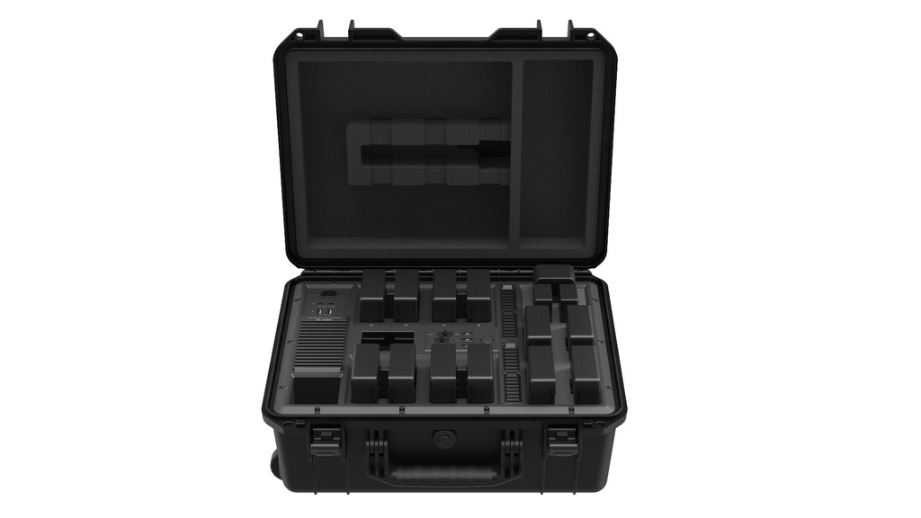 The DJI Battery Station is built within a case that offers maximum storage. It can store up to 12 TB50 Intelligent Batteries, two WB37 Intelligent Batteries, and one WCH2 Charging Hub4. Outfitted with wheels for traveling, the Battery Station supports all-day shoots.