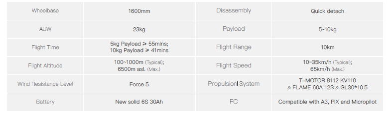 Sistema de propulsión T-MOTOR personalizado: La elección de la seguridad, para las características de larga resistencia, la eficiencia, la fiabilidad y el peso se han optimizado para que sea altamente eficiente, estable y seguro.