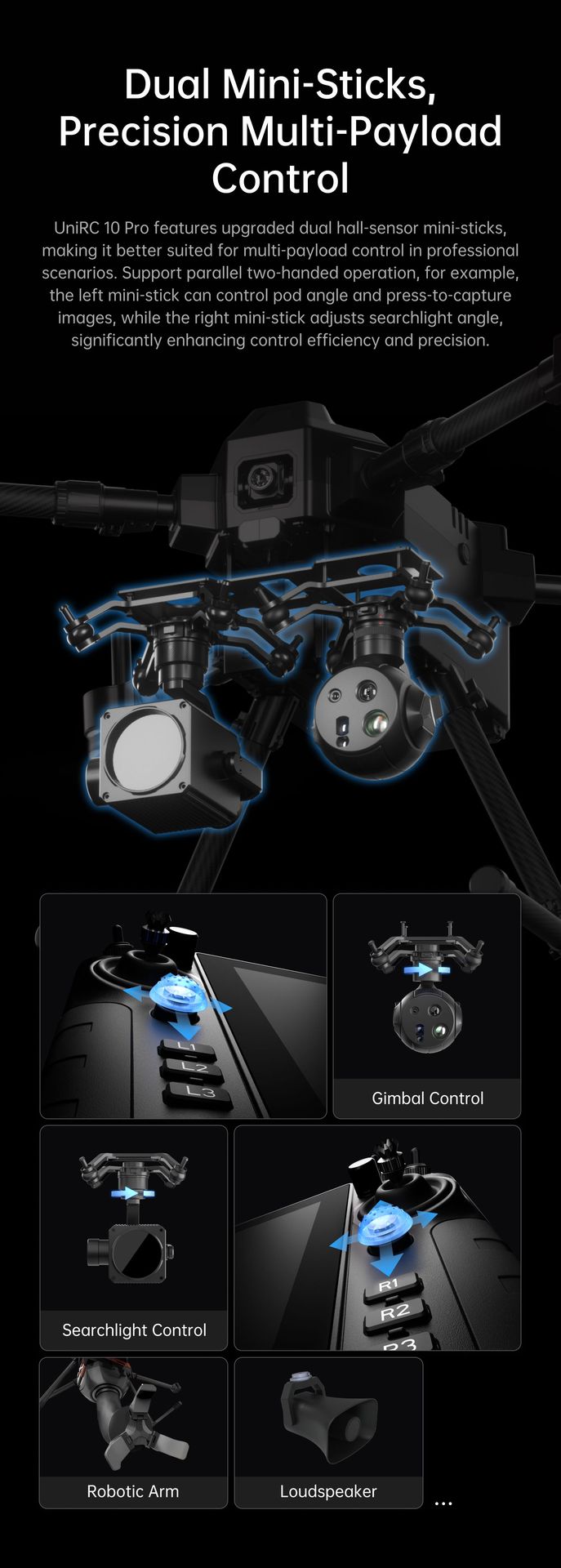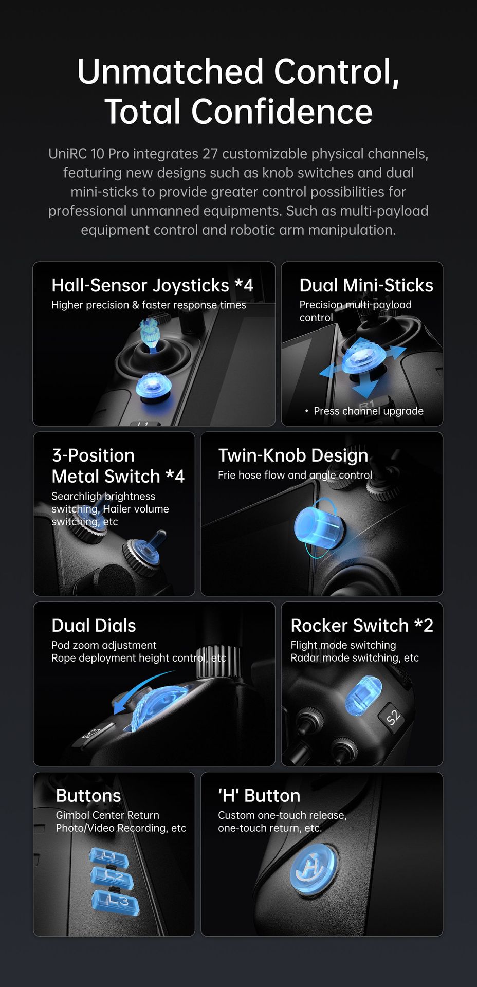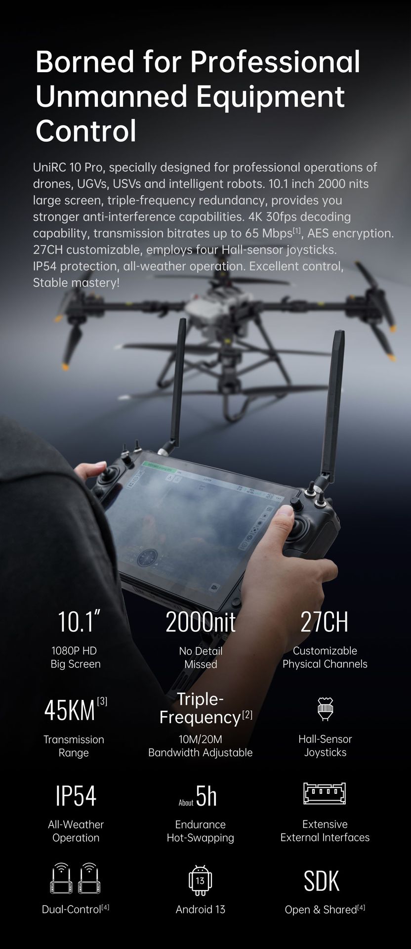 UniRC 10 Pro, especialmente diseñado para operaciones profesionales de drones, vehículos terrestres no tripulados (UGV), submarinos no tripulados (US) y robots inteligentes. Pantalla grande de 10.1 pulgadas y 2000 nits, redundancia de triple frecuencia, que ofrece una mayor capacidad antiinterferencias. Capacidad de decodificación 4K a 30 fps, velocidades de transmisión de hasta 65 Mbps, cifrado AES. 27 canales personalizables, con cuatro joysticks con sensor Hall. Protección IP54, funcionamiento en cualquier clima. Excelente control. ¡Dominio estable!