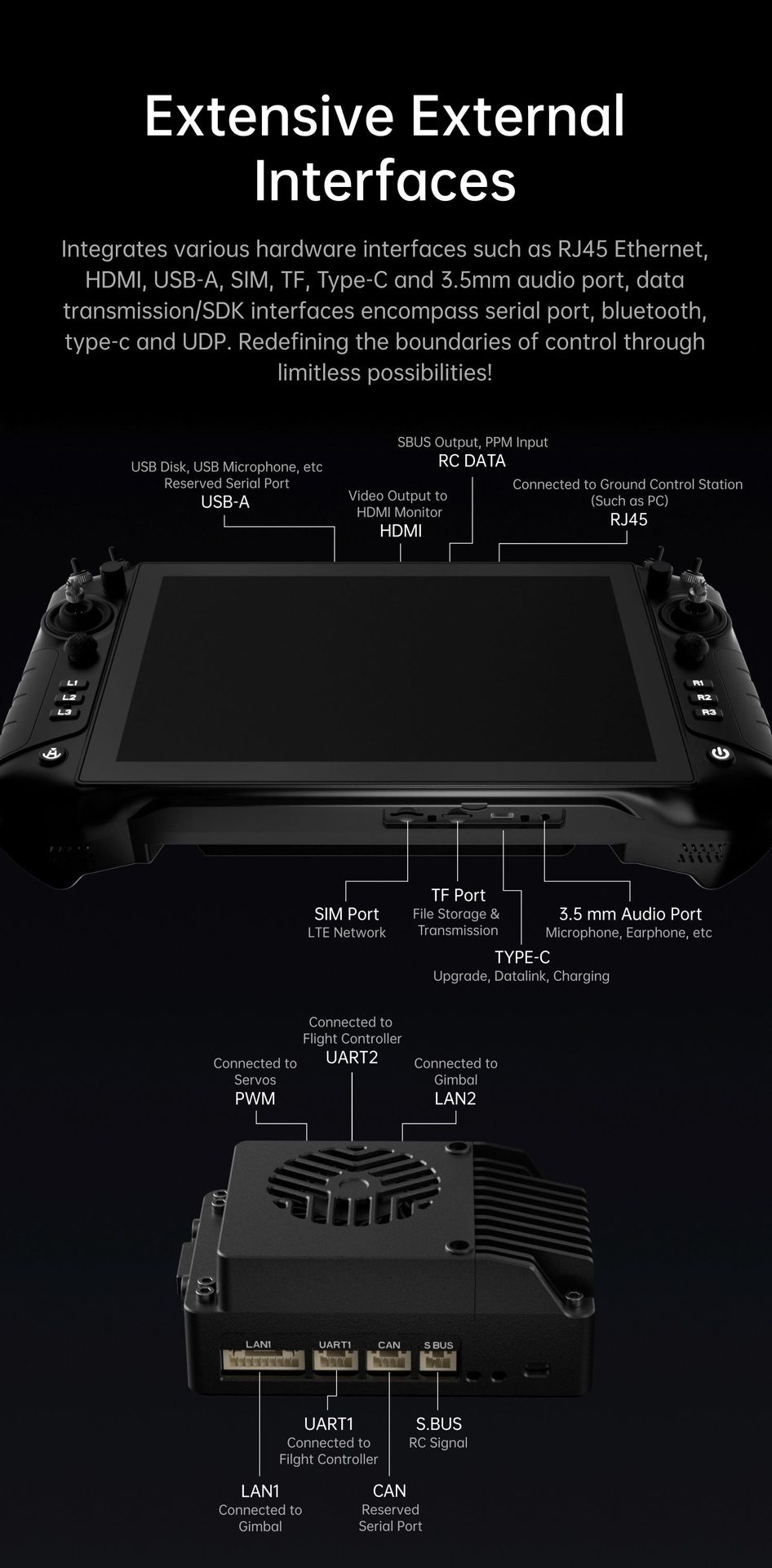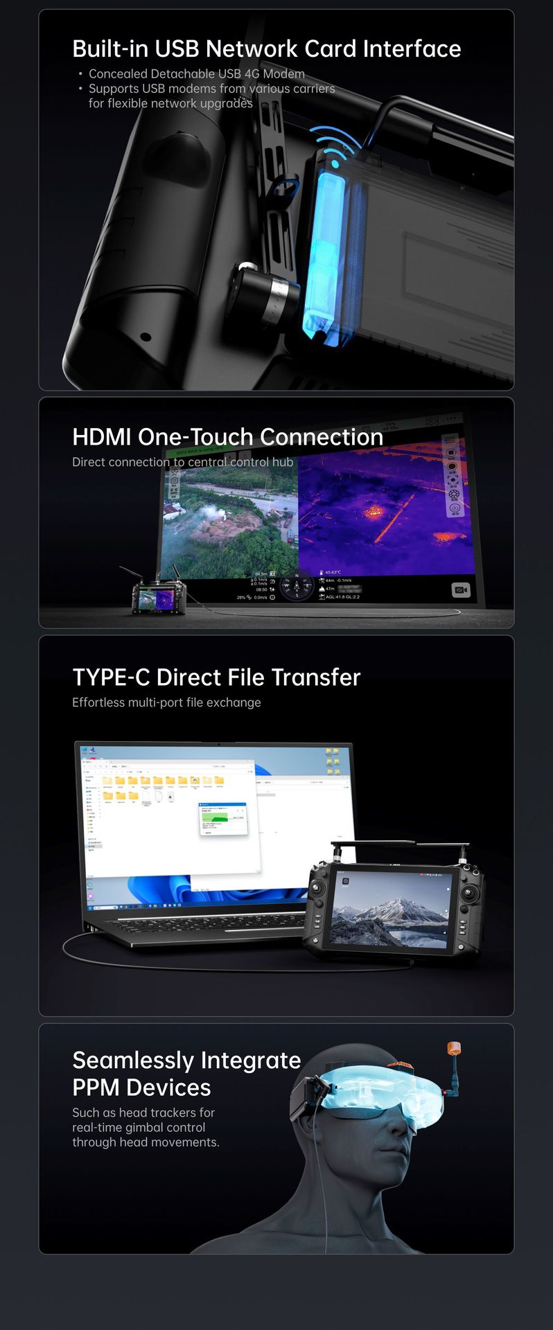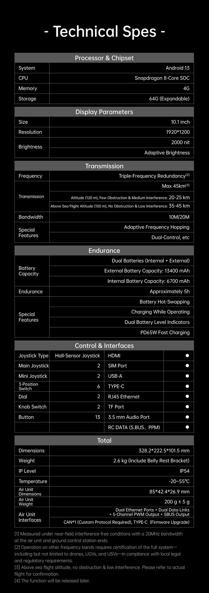 UniRC 10 Pro, especialmente diseñado para operaciones profesionales de drones, vehículos terrestres no tripulados (UGV), submarinos no tripulados (US) y robots inteligentes. Pantalla grande de 10.1 pulgadas y 2000 nits, redundancia de triple frecuencia, que ofrece una mayor capacidad antiinterferencias. Capacidad de decodificación 4K a 30 fps, velocidades de transmisión de hasta 65 Mbps, cifrado AES. 27 canales personalizables, con cuatro joysticks con sensor Hall. Protección IP54, funcionamiento en cualquier clima. Excelente control. ¡Dominio estable!